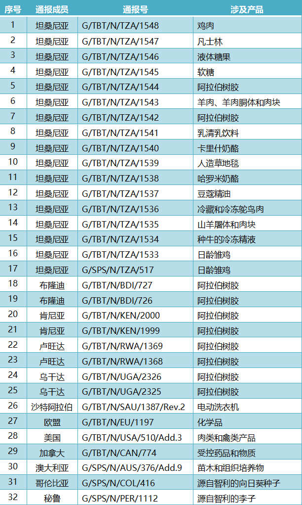 2026年3月13日,共有12个WTO成员通报了32项技术性贸易措施,其中TBT措施28项、SPS措施4项。通报情况为:坦桑尼亚17项、布隆迪2项、肯尼亚2项、卢旺达2项、乌干达2项、沙特阿拉伯1项、欧盟1项、美国1项、加拿大1项、澳大利亚1项、哥伦比亚1项、秘鲁1项。这些措施涉及鸡肉,凡士林,软糖,日龄雏鸡,阿拉伯树胶,电动洗衣机,化学品,苗木和组织培养物等。通报详情如表所示。