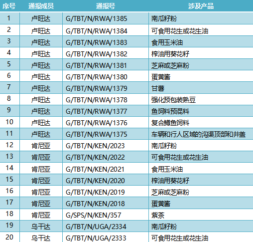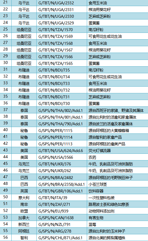 2026年4月1日,共有18个WTO成员通报了56项技术性贸易措施,其中TBT措施40项、SPS措施16项。通报情况为:卢旺达11项、肯尼亚7项、乌干达6项、坦桑尼亚6项、布隆迪6项、泰国3项、秘鲁3项、美国2项、乌克兰2项、巴西2项、英国1项、意大利1项、南非1项、欧盟1项、加拿大1项、新西兰1项、阿根廷1项、智利1项。这些措施涉及食用玉米油,蛋黄酱,甘薯,紫茶,荧光灯镇流器,饮料容器,一次性塑料包装,有害生物,蓝莓等。通报详情如表所示。
