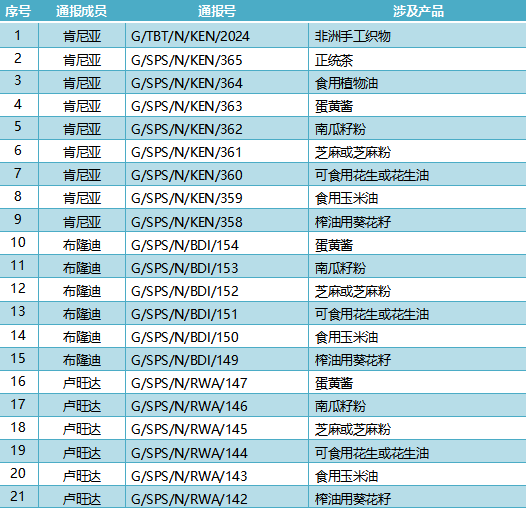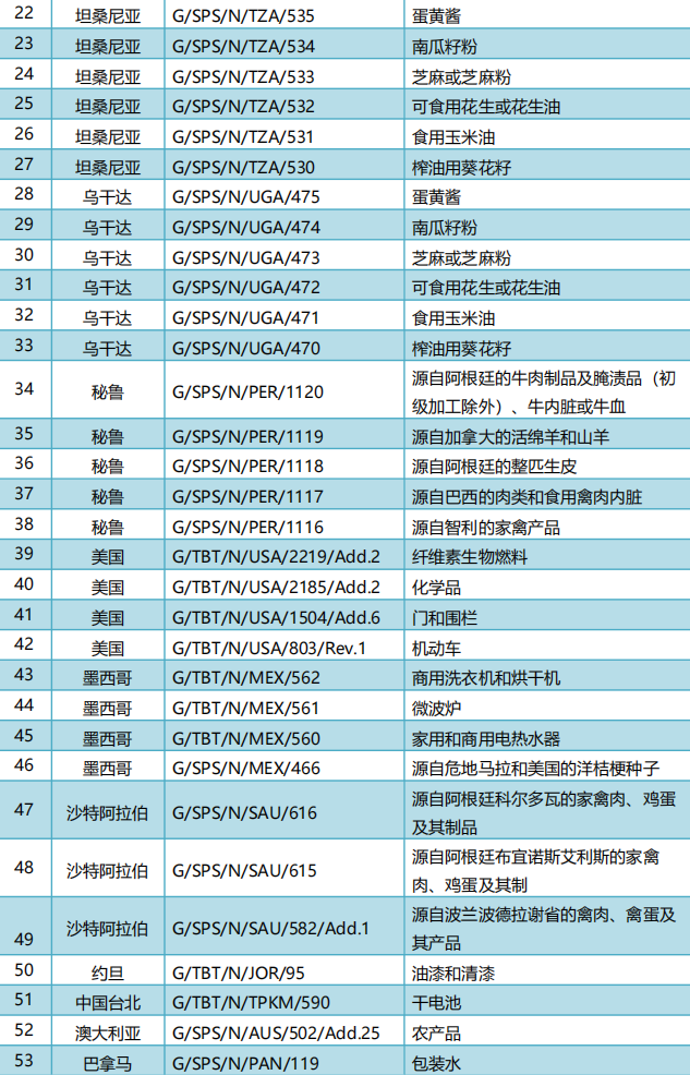 2026年4月2日,共有13个WTO成员通报了53项技术性贸易措施,其中TBT措施10项、SPS措施43项。通报情况为:肯尼亚9项、布隆迪6项、卢旺达6项、坦桑尼亚6项、乌干达6项、秘鲁5项、美国4项、墨西哥4项、沙特阿拉伯3项、约旦1项、中国台北1项、澳大利亚1项、巴拿马1项。这些措施涉及非洲手工织物,食用植物油,纤维素生物燃料,门和围栏,机动车,油漆和清漆,干电池,农产品,包装水等。通报详情如表所示。